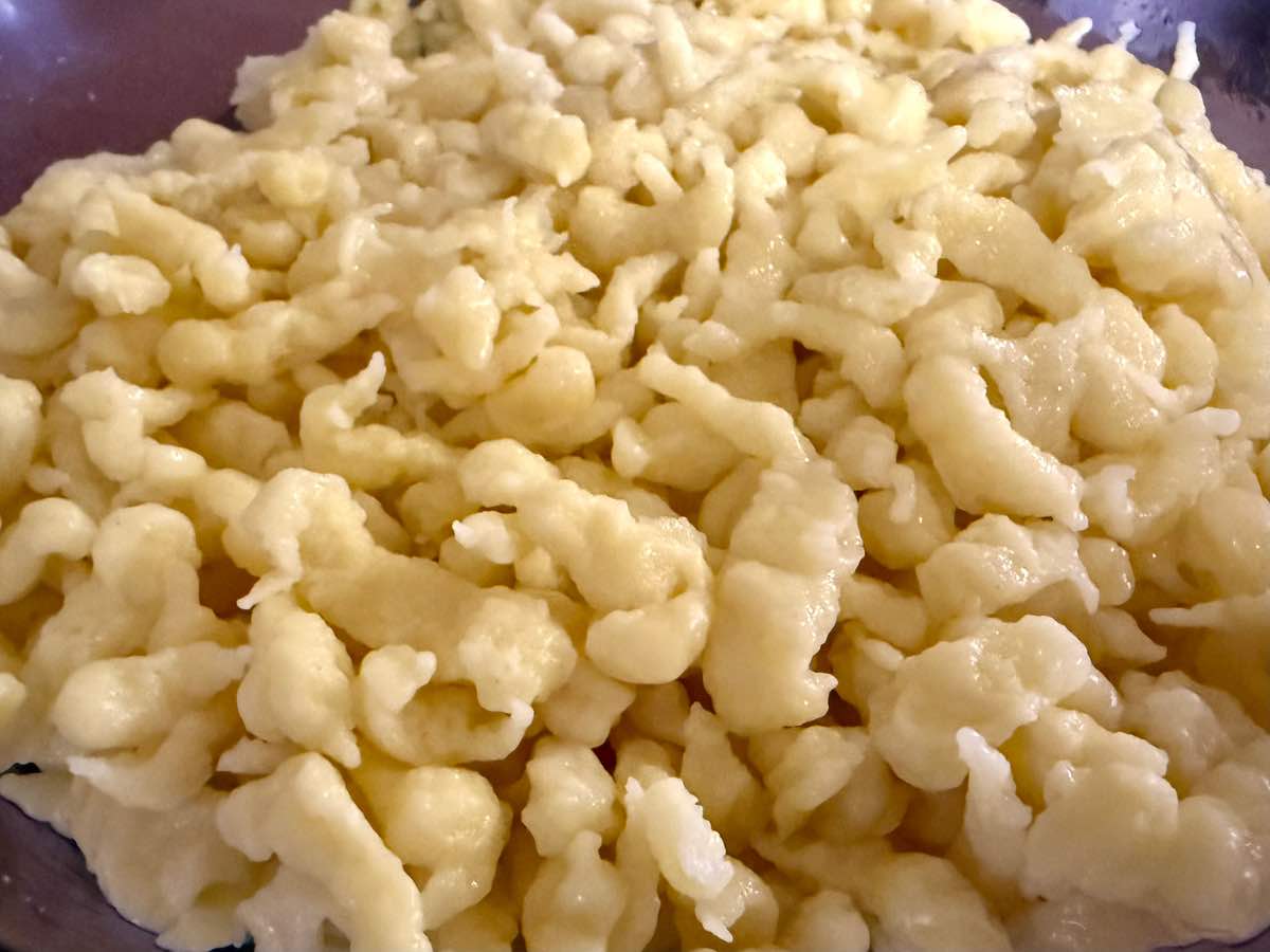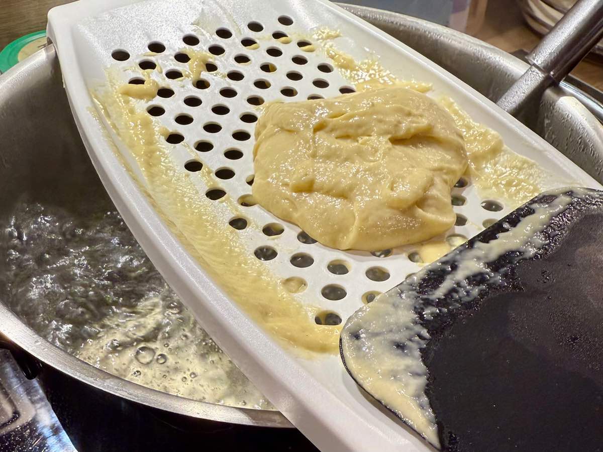 - Teig in das Wasser hobeln und oben schwimmende Knöpfle aus dem Wasser fischen