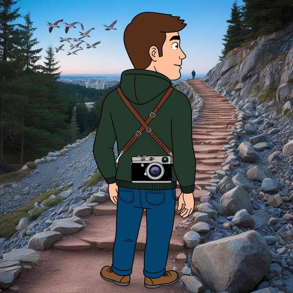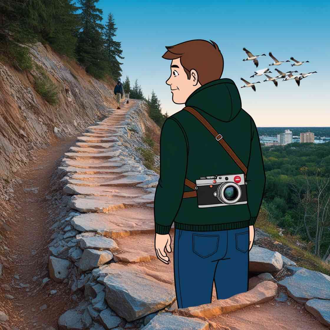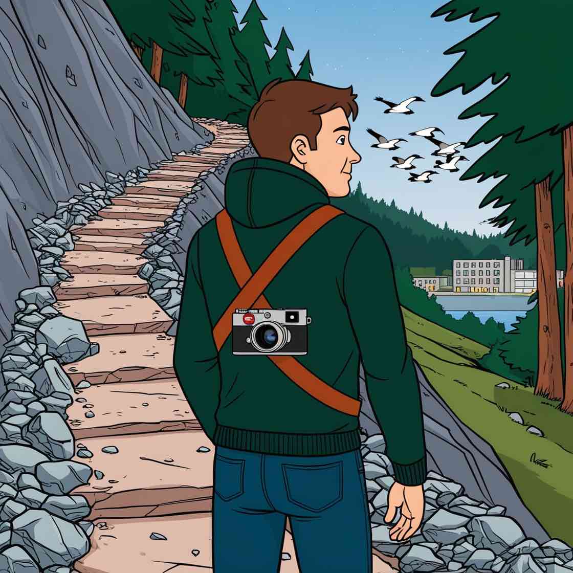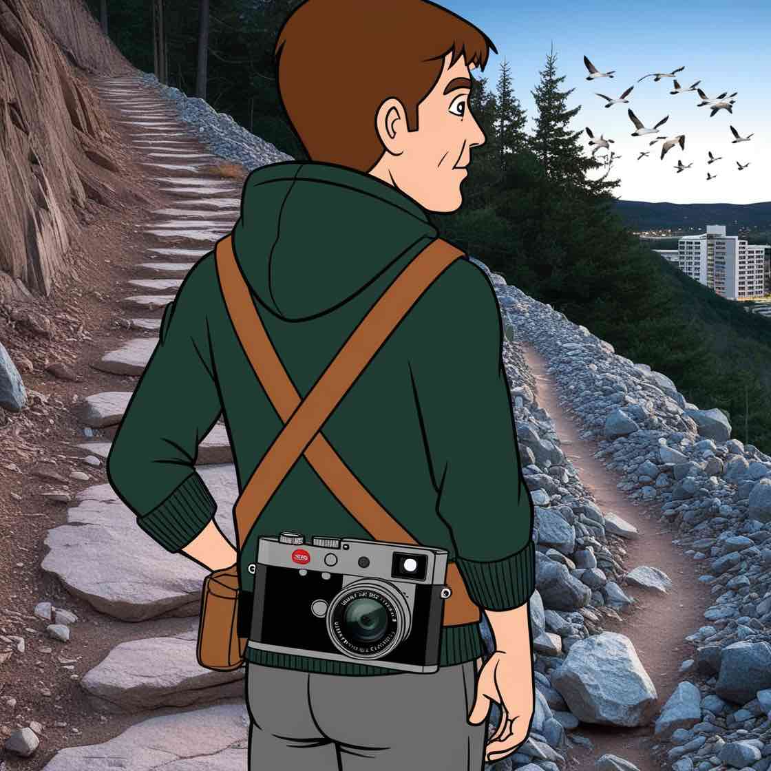 A single, male, cartoon-like figure stands on the edge of a narrow, rocky hiking trail, looks into the distance and is seen from diagonally behind. The figure is wearing a dark green sweater, a hood, short brown hair and a Leica Q2 on the camera strap diagonally across his body. The path winds out of the forest and ends in an urban scene in the distance. It's dusk. The sky is clear, in the distance a flock of geese flies from left to right. Everything is in comic style, including the camera.