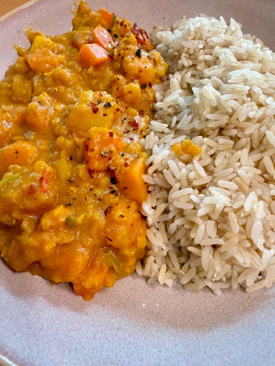 Zum Curry mache ich gerne Naturreis. Schmeckt aber auch zu einem Baguette oder sogar ohne Beilage.